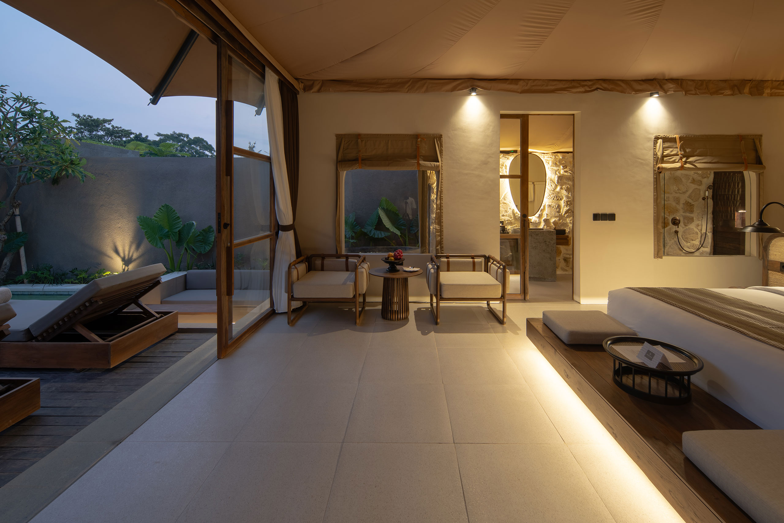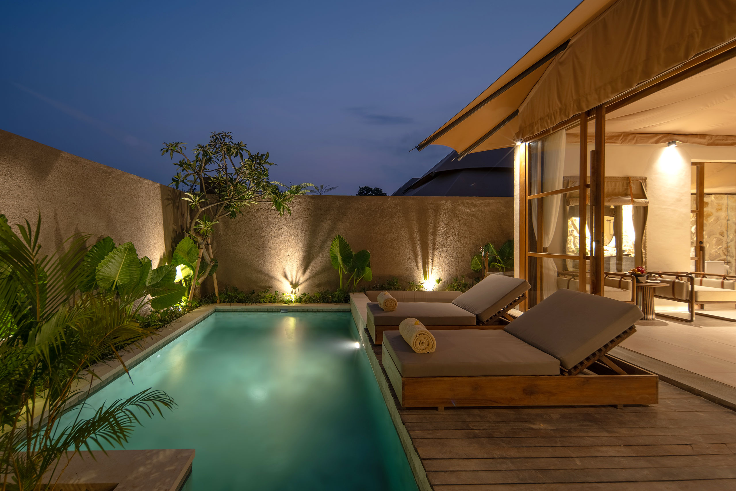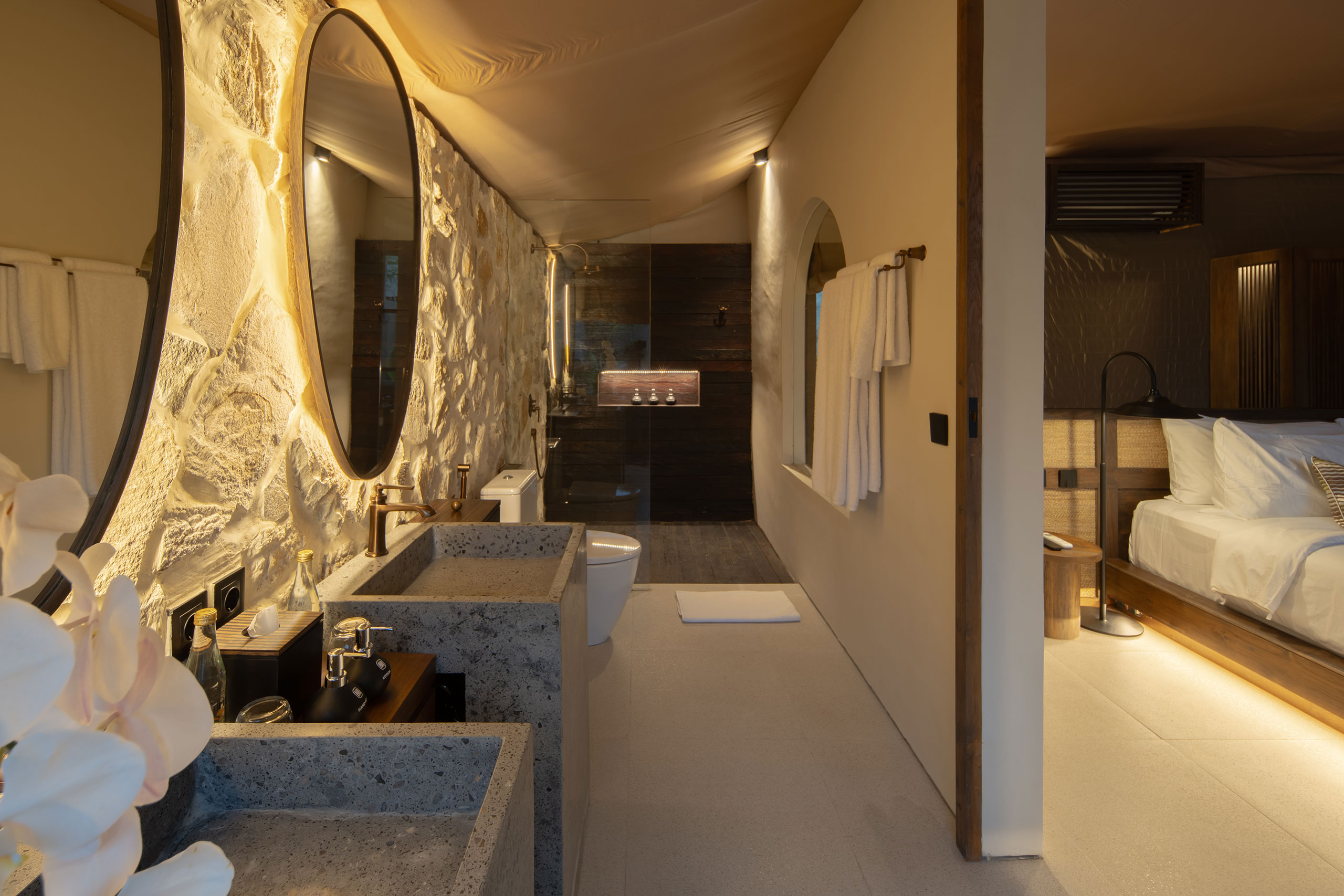 Immerse yourself in a private sanctuary at the One Bedroom Garden Pool Tent. Each of these exquisite retreats boasts a sprawling 120 square meters of space, featuring a luxurious six-meter private pool and inviting sun loungers. Indulge in a luxurious dual-sink bathroom, complete with both indoor showers and an inviting outdoor soaking tub. Modern comfort awaits with amenities including a smart TV, WiFi access, a bathtub, shower, and double washbasin.